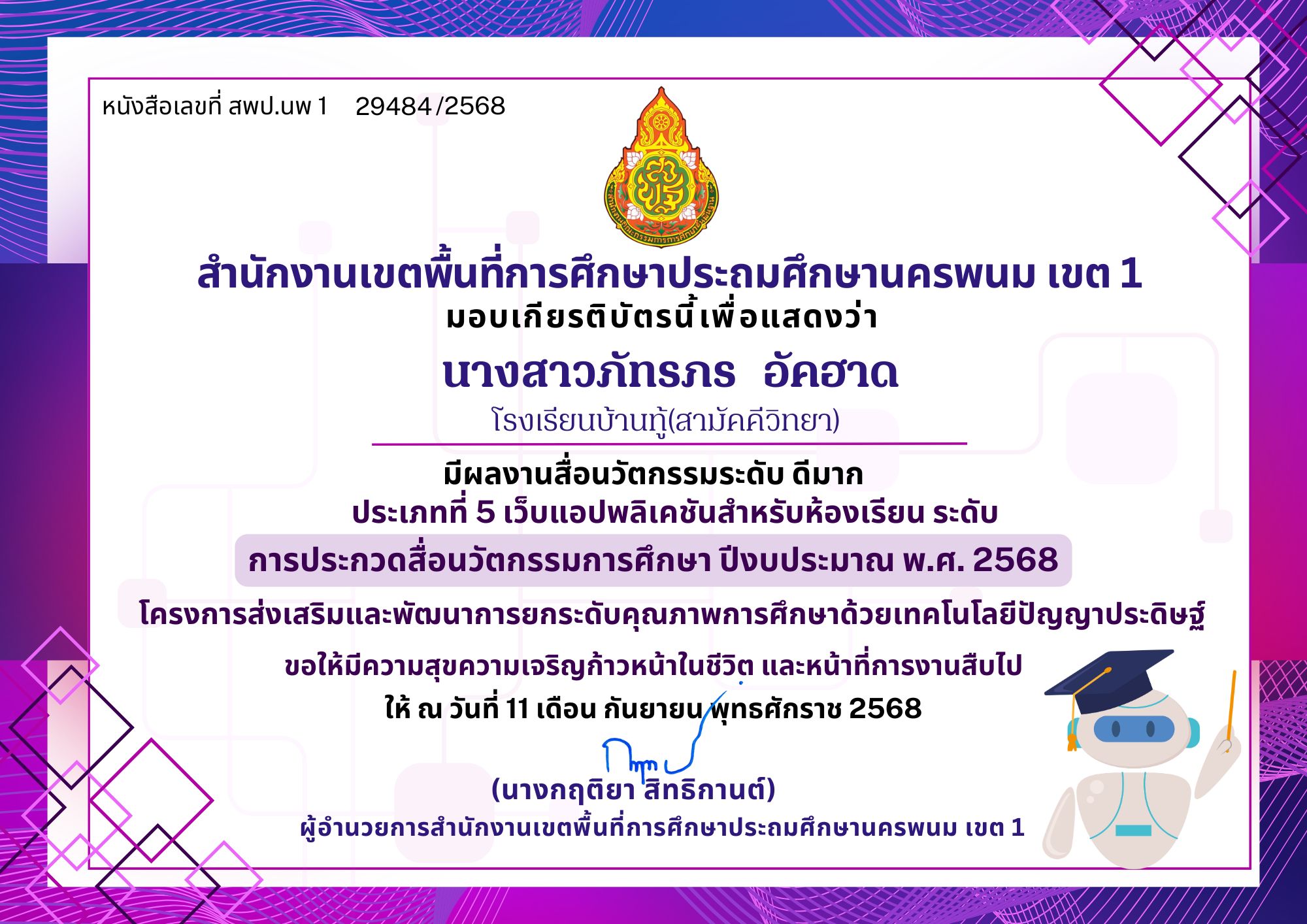 สื่อนวัตกรรมระดับดีมาก ประเภทที่5 เว็บแอปพลิเคชัน ระดับห้องเรียน
